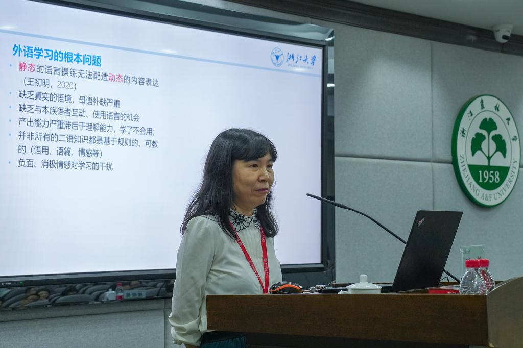 在专家报告环节,浙江大学王敏教授做了题为“基于互动协同的大学外语教学研究:理论与方法”的主旨报告。报告从大学英语的根本目标和外语学习的根本问题切入,介绍了协同的定义,讲解了协同与二语习得的关系,从协同的认知机制关联到协同与互动促学的关系;又基于心理认知视角、社会认知视角、国内外研究现状及团队的实证研究,阐述了协同促学的适切性和有效性,提出了基于协同(续论)的教学模式。之后,浙江工商大学李丹弟教授带来第二场专家报告:数智化背景下大学外语教学的转型思考。李教授从四个层面展开,讲述了数智化时代大学外语教学面临的挑战与机遇,提醒大学外语教育者需要重新认识高等教育、教师自身和学习者。报告发人深思,“数智化”推动大学外语改革,始终以“提高人才培养质量、推动外语教育发展”为目的,大学外语教师们要拥抱变化,开拓进取,积极探索“数智化”背景下外语教学的新路径。
